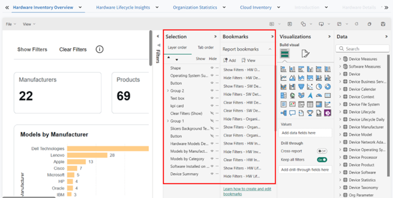The Bookmarks and Selection pane appears.noteAfter enabling the panels from Settings, don’t use View-> Selection or Bookmarks as that operates only on runtime basis and may lead to inconsistencies in generated reports.