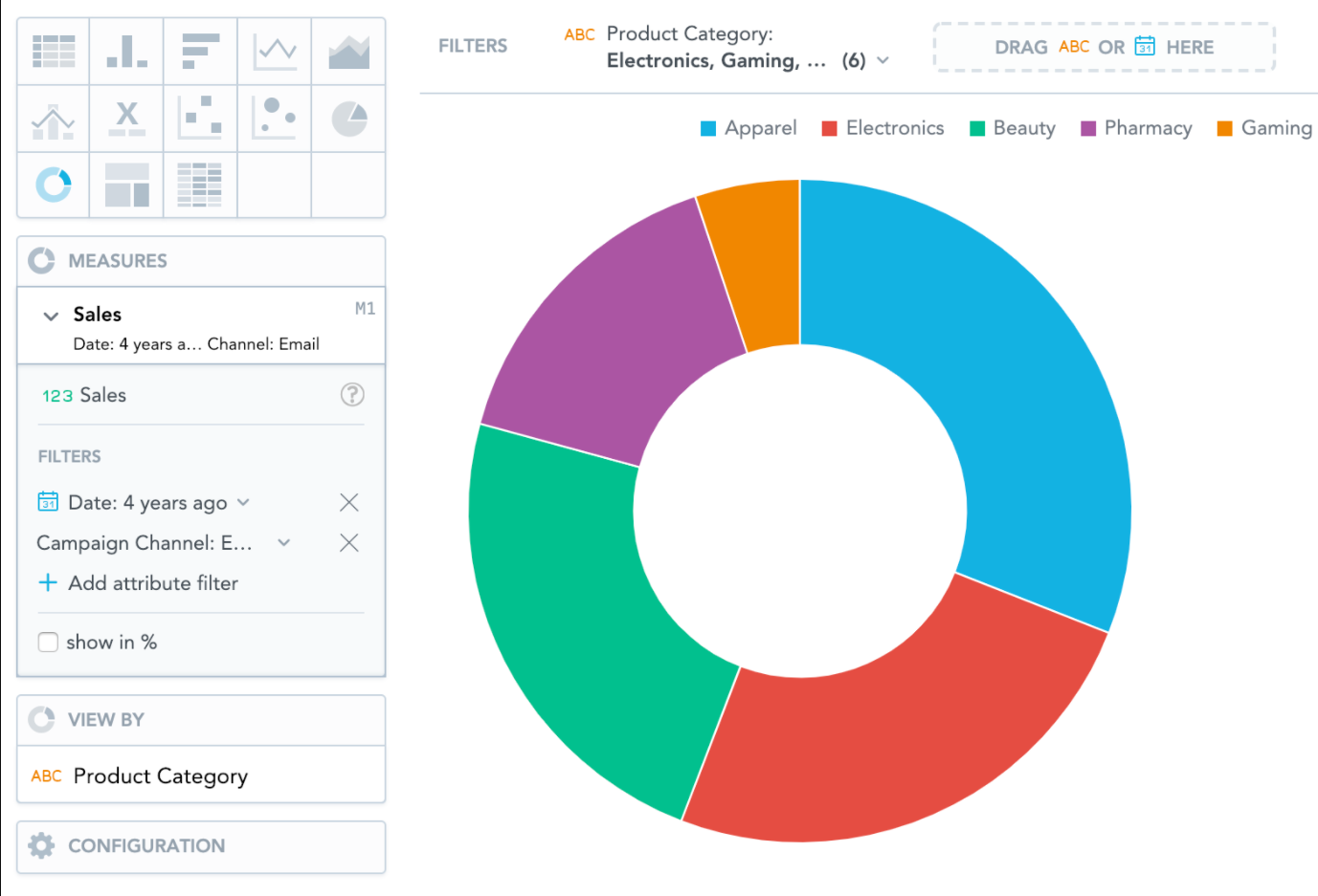 Donut charts show data as proportional segments of a disc with a hollowed-out center. Donut charts can be segmented by either multiple measures or an attribute and allow viewers to visualize component parts of a whole.