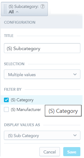 To customize the attribute filter such as changing its display name, the type of selection, and the way the individual attribute’s values are displayed, click the attribute filter, and then click the Configuration icon. The Configuration properties box opens. You can do the following:
