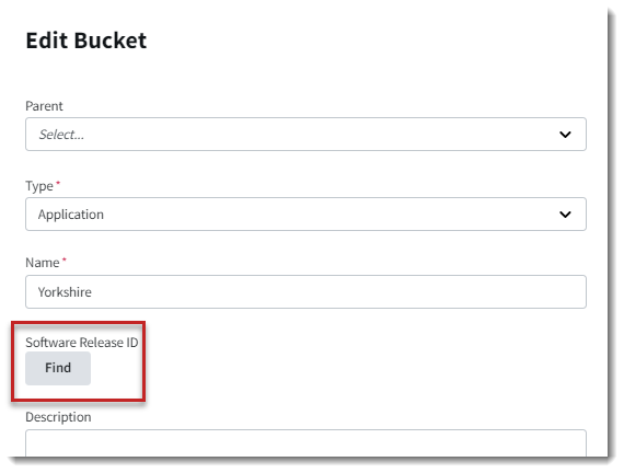 On the Create Bucket or the Edit Bucket slideout, locate the Software Release ID field. (If necessary, refer to the instructions in Creating a Bucket or Editing a Bucket for accessing either slideout.)